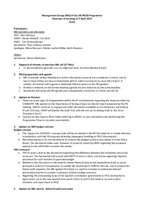 Home Document Library MG_Minutes 3 Apr 2013 Rev MG_Minutes 3 Apr 2013 rev Mon, 15 Apr, 2013 Download the resource Format: application/pdf Size: (0.346 MB) download Filed under: Category Empty Related publications View all Foundation documents 23 May, 2025UN-REDD Programme Developer 23/05/2025 - Document Download English 21 May, 2025UN-REDD Programme Draft UN-REDD 2026-2030 Strategy Download English 21 May, 2025UN-REDD Programme Draft Monitoring and Evaluation Framework UN-REDD 2026-30 Download English