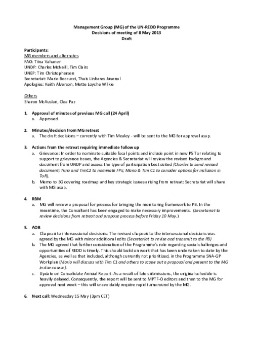 Home Document Library MG_Minutes 8 May 2013 MG_Minutes 8 May 2013 Thu, 30 May, 2013 Download the resource Format: application/pdf Size: (0.342 MB) download Filed under: Category Empty Related publications View all Foundation documents 23 May, 2025UN-REDD Programme Developer 23/05/2025 - Document Download English 21 May, 2025UN-REDD Programme Draft UN-REDD 2026-2030 Strategy Download English 21 May, 2025UN-REDD Programme Draft Monitoring and Evaluation Framework UN-REDD 2026-30 Download English