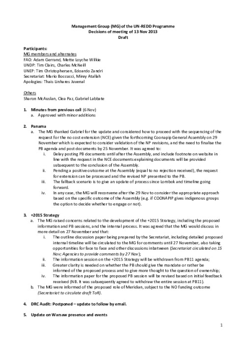 Home Document Library MG_Minutes_13_Nov_2013 MG_Minutes_13_Nov_2013 Mon, 10 Feb, 2014 Download the resource Format: application/pdf Size: (0.343 MB) download Filed under: Category Empty Related publications View all Foundation documents 23 May, 2025UN-REDD Programme Developer 23/05/2025 - Document Download English 21 May, 2025UN-REDD Programme Draft UN-REDD 2026-2030 Strategy Download English 21 May, 2025UN-REDD Programme Draft Monitoring and Evaluation Framework UN-REDD 2026-30 Download English