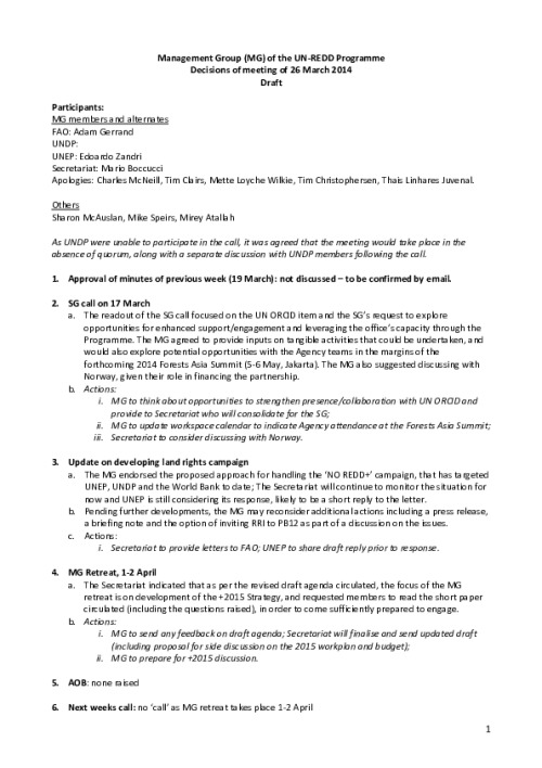 Home Document Library MG_Minutes_26_March_2014 MG_Minutes_26_March_2014 Fri, 23 May, 2014 Download the resource Format: application/pdf Size: (0.426 MB) download Filed under: Category Empty Related publications View all Foundation documents 23 May, 2025UN-REDD Programme Developer 23/05/2025 - Document Download English 21 May, 2025UN-REDD Programme Draft UN-REDD 2026-2030 Strategy Download English 21 May, 2025UN-REDD Programme Draft Monitoring and Evaluation Framework UN-REDD 2026-30 Download English