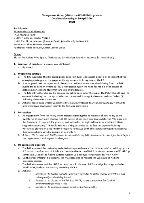 Home Document Library MG_Minutes_30_April_2014 MG_Minutes_30_April_2014 Fri, 23 May, 2014 Download the resource Format: application/pdf Size: (0.566 MB) download Filed under: Category Empty Related publications View all Foundation documents 23 May, 2025UN-REDD Programme Developer 23/05/2025 - Document Download English 21 May, 2025UN-REDD Programme Draft UN-REDD 2026-2030 Strategy Download English 21 May, 2025UN-REDD Programme Draft Monitoring and Evaluation Framework UN-REDD 2026-30 Download English
