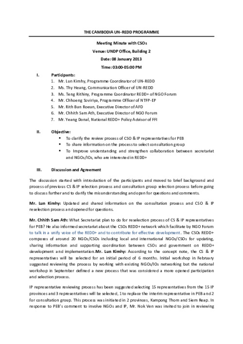 Home Document Library Minutes Meeting With CSOs To Discuss Reselection Process Jan 8 2013 Minutes Meeting with CSOs to discuss reselection process Jan 8 2013 Thu, 14 Mar, 2013 Download the resource Format: application/pdf Size: (0.289 MB) download Filed under: Category Empty Related publications View all Foundation documents 23 May, 2025UN-REDD Programme Developer 23/05/2025 - Document Download English 21 May, 2025UN-REDD Programme Draft UN-REDD 2026-2030 Strategy Download English 21 May, 2025UN-REDD Programme Draft Monitoring and Evaluation Framework UN-REDD 2026-30 Download English