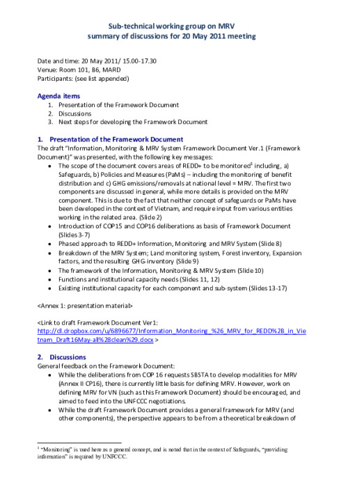 Home Document Library Minutes MRV Sub-technical Working Group Meeting May 2011 Minutes MRV Sub-technical working group meeting May 2011 Tue, 29 Oct, 2013 Download the resource Format: application/pdf Size: (0.289 MB) download Filed under: Category Empty Related publications View all Foundation documents 23 May, 2025UN-REDD Programme Developer 23/05/2025 - Document Download English 21 May, 2025UN-REDD Programme Draft UN-REDD 2026-2030 Strategy Download English 21 May, 2025UN-REDD Programme Draft Monitoring and Evaluation Framework UN-REDD 2026-30 Download English