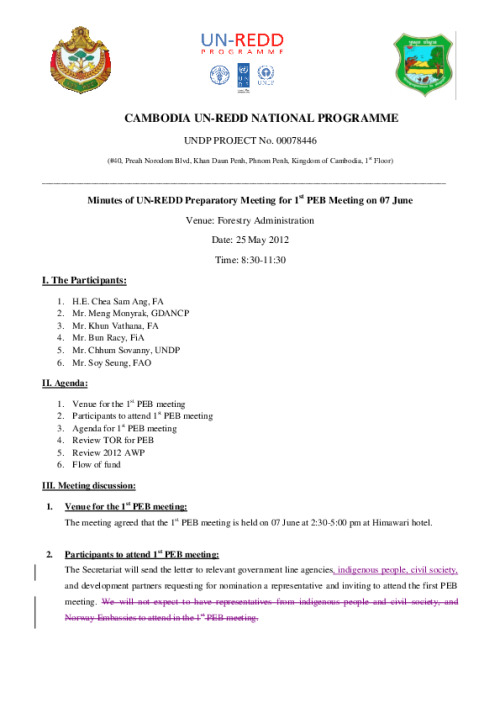 Home Document Library Minutes of PEB Preparatory Meeting 2012 05 25 Minutes of PEB preparatory meeting 2012 05 25 Thu, 14 Mar, 2013 Download the resource Format: application/pdf Size: (0.29 MB) download Filed under: Category Empty Related publications View all Foundation documents 23 May, 2025UN-REDD Programme Developer 23/05/2025 - Document Download English 21 May, 2025UN-REDD Programme Draft UN-REDD 2026-2030 Strategy Download English 21 May, 2025UN-REDD Programme Draft Monitoring and Evaluation Framework UN-REDD 2026-30 Download English