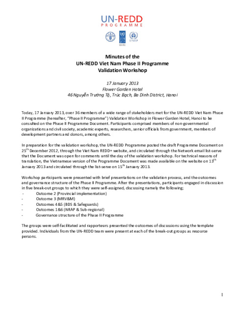 Home Document Library Minutes of The UN-REDD Viet Nam Phase II Validation Workshop (17 January 2013) Minutes of the UN-REDD Viet Nam Phase II Validation workshop (17 January 2013) Tue, 29 Oct, 2013 Download the resource Format: application/pdf Size: (0.407 MB) download Filed under: Category Empty Related publications View all Foundation documents 23 May, 2025UN-REDD Programme Developer 23/05/2025 - Document Download English 21 May, 2025UN-REDD Programme Draft UN-REDD 2026-2030 Strategy Download English 21 May, 2025UN-REDD Programme Draft Monitoring and Evaluation Framework UN-REDD 2026-30 Download English