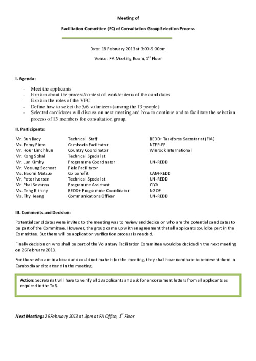 Home Document Library Minutes VFC Meeting-2013-02-18 Minutes VFC Meeting-2013-02-18 Thu, 08 May, 2014 Download the resource Format: application/pdf Size: (0.332 MB) download Filed under: Category Empty Related publications View all Foundation documents 23 May, 2025UN-REDD Programme Developer 23/05/2025 - Document Download English 21 May, 2025UN-REDD Programme Draft UN-REDD 2026-2030 Strategy Download English 21 May, 2025UN-REDD Programme Draft Monitoring and Evaluation Framework UN-REDD 2026-30 Download English