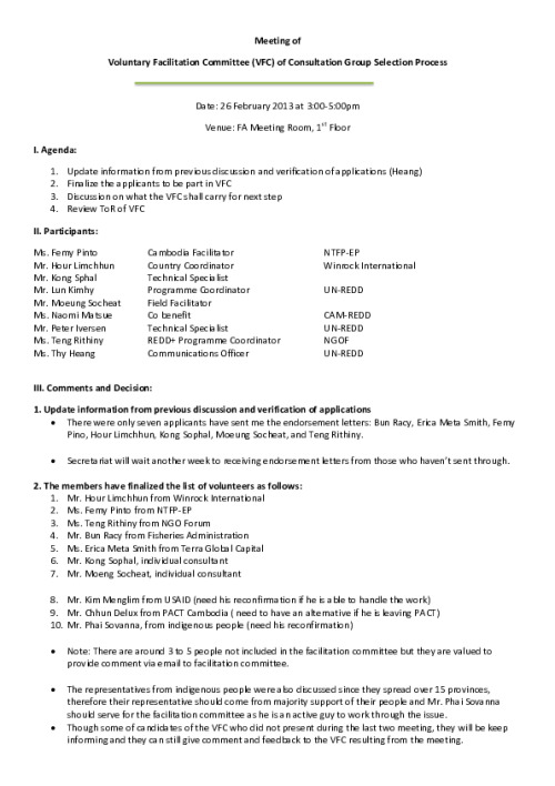 Home Document Library Minutes of VFC Meeting-2013-02-26 N Minutes of VFC Meeting-2013-02-26 n Thu, 08 May, 2014 Download the resource Format: application/pdf Size: (0.368 MB) download Filed under: Category Empty Related publications View all Foundation documents 23 May, 2025UN-REDD Programme Developer 23/05/2025 - Document Download English 21 May, 2025UN-REDD Programme Draft UN-REDD 2026-2030 Strategy Download English 21 May, 2025UN-REDD Programme Draft Monitoring and Evaluation Framework UN-REDD 2026-30 Download English