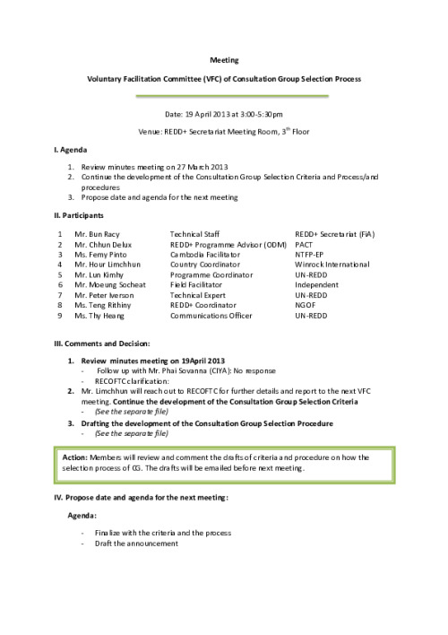 Home Document Library Minutes of VFC Meeting-2013-04-19 Minutes of VFC Meeting-2013-04-19 Thu, 08 May, 2014 Download the resource Format: application/pdf Size: (0.349 MB) download Filed under: Category Empty Related publications View all Foundation documents 23 May, 2025UN-REDD Programme Developer 23/05/2025 - Document Download English 21 May, 2025UN-REDD Programme Draft UN-REDD 2026-2030 Strategy Download English 21 May, 2025UN-REDD Programme Draft Monitoring and Evaluation Framework UN-REDD 2026-30 Download English