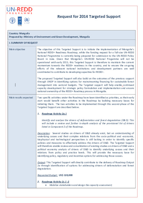 Home Document Library Mongolia Targeted Support Request Form 2014 Mongolia Targeted Support Request form 2014 Tue, 27 May, 2014 Download the resource Format: application/pdf Size: (1.914 MB) download Filed under: Tags Mongolia Targeted support 2014 request Category Empty Related publications View all Foundation documents 23 May, 2025UN-REDD Programme Developer 23/05/2025 - Document Download English 21 May, 2025UN-REDD Programme Draft UN-REDD 2026-2030 Strategy Download English 21 May, 2025UN-REDD Programme Draft Monitoring and Evaluation Framework UN-REDD 2026-30 Download English