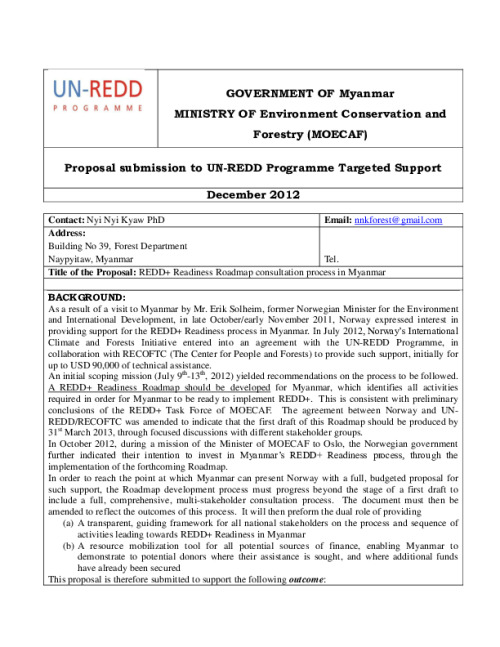 Home Document Library Myanmar Targeted Support Proposal Myanmar Targeted Support proposal Fri, 07 Feb, 2014 Download the resource Format: application/pdf Size: (0.22 MB) download Filed under: Category Empty Related publications View all Foundation documents 23 May, 2025UN-REDD Programme Developer 23/05/2025 - Document Download English 21 May, 2025UN-REDD Programme Draft UN-REDD 2026-2030 Strategy Download English 21 May, 2025UN-REDD Programme Draft Monitoring and Evaluation Framework UN-REDD 2026-30 Download English