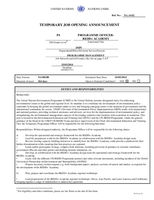 Home Document Library NA-14-02 - Programme Officer REDD Academy - P-4 - NRB FINAL NA-14-02 - Programme Officer REDD Academy - P-4 - NRB FINAL Thu, 27 Feb, 2014 Download the resource Format: application/pdf Size: (0.043 MB) download Filed under: Category Empty Related publications View all Foundation documents 23 May, 2025UN-REDD Programme Developer 23/05/2025 - Document Download English 21 May, 2025UN-REDD Programme Draft UN-REDD 2026-2030 Strategy Download English 21 May, 2025UN-REDD Programme Draft Monitoring and Evaluation Framework UN-REDD 2026-30 Download English