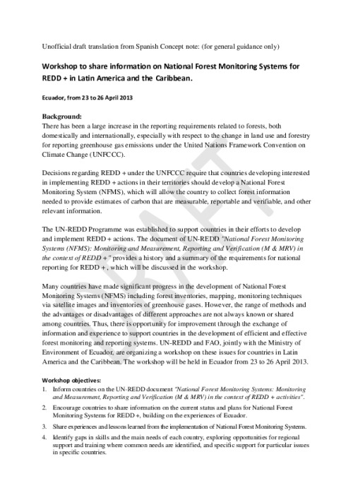 Home Document Library NFMS_workshop_Draft_Concept Note_EN NFMS_workshop_Draft_Concept note_EN Fri, 24 May, 2013 Download the resource Format: application/pdf Size: (0.118 MB) download Filed under: Category Empty Related publications View all Foundation documents 23 May, 2025UN-REDD Programme Developer 23/05/2025 - Document Download English 21 May, 2025UN-REDD Programme Draft UN-REDD 2026-2030 Strategy Download English 21 May, 2025UN-REDD Programme Draft Monitoring and Evaluation Framework UN-REDD 2026-30 Download English