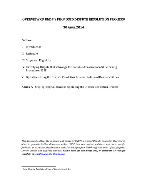 Home Document Library Overview - Dispute Resolution Process (Revised 30 April) Overview - Dispute Resolution Process (Revised 30 April) Thu, 01 May, 2014 Download the resource Format: application/pdf Size: (0.708 MB) download Filed under: Category Empty Related publications View all Foundation documents 23 May, 2025UN-REDD Programme Developer 23/05/2025 - Document Download English 21 May, 2025UN-REDD Programme Draft UN-REDD 2026-2030 Strategy Download English 21 May, 2025UN-REDD Programme Draft Monitoring and Evaluation Framework UN-REDD 2026-30 Download English