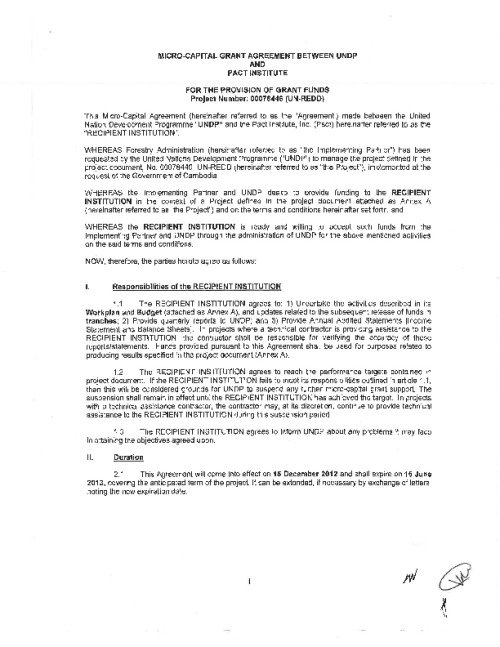 Home Document Library PACT Micro-Capital Grant Agreement 2 PACT Micro-Capital Grant Agreement 2 Sun, 04 May, 2014 Download the resource Format: application/pdf Size: (1.064 MB) download Filed under: Category Empty Related publications View all Foundation documents 23 May, 2025UN-REDD Programme Developer 23/05/2025 - Document Download English 21 May, 2025UN-REDD Programme Draft UN-REDD 2026-2030 Strategy Download English 21 May, 2025UN-REDD Programme Draft Monitoring and Evaluation Framework UN-REDD 2026-30 Download English