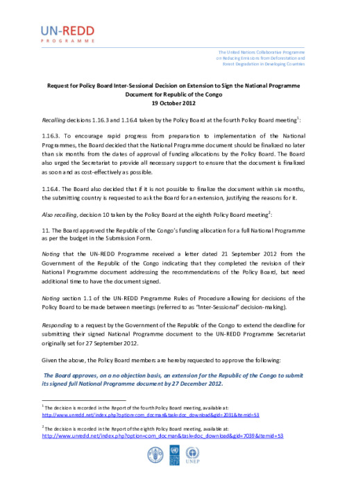 Home Document Library PB Intersessional Decision Request 20_extension Request To Sign NPD - Republic of The Congo-EN PB Intersessional Decision Request 20_extension request to sign NPD - Republic of the Congo-EN Fri, 27 Sep, 2013 Download the resource Format: application/pdf Size: (0.43 MB) download Filed under: Category Intersessional Decisions Related publications View all Foundation documents 23 May, 2025UN-REDD Programme Developer 23/05/2025 - Document Download English 21 May, 2025UN-REDD Programme Draft UN-REDD 2026-2030 Strategy Download English 21 May, 2025UN-REDD Programme Draft Monitoring and Evaluation Framework UN-REDD 2026-30 Download English