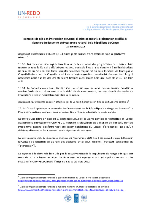 Home Document Library PB Intersessional Decision Request 20_extension Request To Sign NPD - Republic of The Congo-FR PB Intersessional Decision Request 20_extension request to sign NPD - Republic of the Congo-FR Fri, 27 Sep, 2013 Download the resource Format: application/pdf Size: (0.66 MB) download Filed under: Category Intersessional Decisions Related publications View all Foundation documents 23 May, 2025UN-REDD Programme Developer 23/05/2025 - Document Download English 21 May, 2025UN-REDD Programme Draft UN-REDD 2026-2030 Strategy Download English 21 May, 2025UN-REDD Programme Draft Monitoring and Evaluation Framework UN-REDD 2026-30 Download English