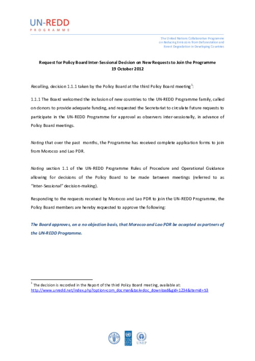 Home Document Library PB Intersessional Decision Request 21_new Requests To Join The Programme_ Marocco and Lao PDR-EN PB Intersessional Decision Request 21_new requests to join the programme_ Marocco and Lao PDR-EN Fri, 27 Sep, 2013 Download the resource Format: application/pdf Size: (0.423 MB) download Filed under: Category Intersessional Decisions Related publications View all Foundation documents 23 May, 2025UN-REDD Programme Developer 23/05/2025 - Document Download English 21 May, 2025UN-REDD Programme Draft UN-REDD 2026-2030 Strategy Download English 21 May, 2025UN-REDD Programme Draft Monitoring and Evaluation Framework UN-REDD 2026-30 Download English