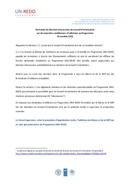 Home Document Library PB Intersessional Decision Request 21_new Requests To Join The Programme_ Morocco and Lao PDR-FR PB Intersessional Decision Request 21_new requests to join the programme_ Morocco and Lao PDR-FR Fri, 27 Sep, 2013 Download the resource Format: application/pdf Size: (0.577 MB) download Filed under: Category Intersessional Decisions Related publications View all Foundation documents 23 May, 2025UN-REDD Programme Developer 23/05/2025 - Document Download English 21 May, 2025UN-REDD Programme Draft UN-REDD 2026-2030 Strategy Download English 21 May, 2025UN-REDD Programme Draft Monitoring and Evaluation Framework UN-REDD 2026-30 Download English