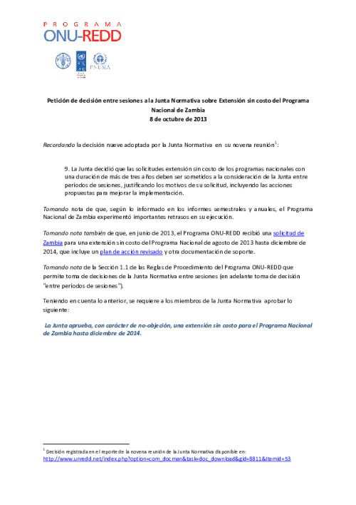 Home Document Library PB Intersessional Decision Request 28_no-cost Extension Zambia National Programme_SP PB Intersessional Decision Request 28_no-cost extension Zambia National Programme_SP Fri, 27 Sep, 2013 Download the resource Format: application/pdf Size: (0.366 MB) download Filed under: Category Intersessional Decisions Related publications View all Foundation documents 23 May, 2025UN-REDD Programme Developer 23/05/2025 - Document Download English 21 May, 2025UN-REDD Programme Draft UN-REDD 2026-2030 Strategy Download English 21 May, 2025UN-REDD Programme Draft Monitoring and Evaluation Framework UN-REDD 2026-30 Download English