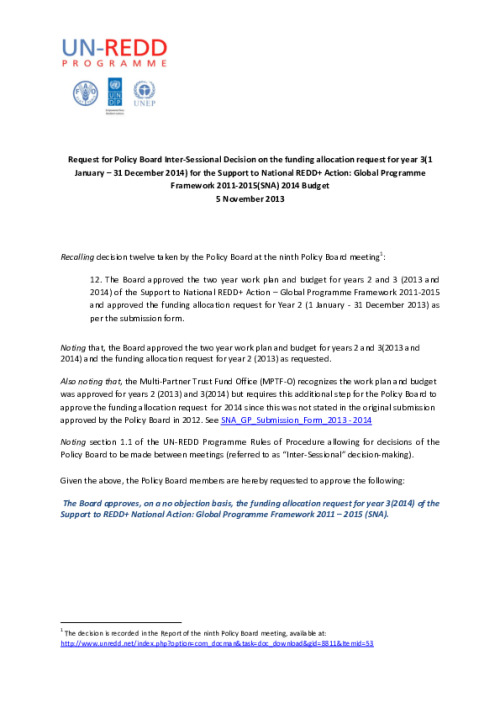 Home Document Library PB Intersessional Decision Request 29_Funding_Allocation_Request_SNA 2014 Budget_EN PB Intersessional Decision Request 29_Funding_Allocation_Request_SNA 2014 Budget_EN Fri, 14 Mar, 2014 Download the resource Format: application/pdf Size: (0.584 MB) download Filed under: Category Intersessional Decisions Related publications View all Foundation documents 23 May, 2025UN-REDD Programme Developer 23/05/2025 - Document Download English 21 May, 2025UN-REDD Programme Draft UN-REDD 2026-2030 Strategy Download English 21 May, 2025UN-REDD Programme Draft Monitoring and Evaluation Framework UN-REDD 2026-30 Download English