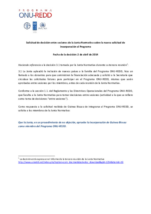 Home Document Library PB Intersessional Decision Request 32_ New Request To Join The Programme_Guinea Bissau_SP PB intersessional decision request 32_ New Request to Join the Programme_Guinea Bissau_SP Wed, 02 Apr, 2014 Download the resource Format: application/pdf Size: (0.286 MB) download Filed under: Category Intersessional Decisions Related publications View all Foundation documents 23 May, 2025UN-REDD Programme Developer 23/05/2025 - Document Download English 21 May, 2025UN-REDD Programme Draft UN-REDD 2026-2030 Strategy Download English 21 May, 2025UN-REDD Programme Draft Monitoring and Evaluation Framework UN-REDD 2026-30 Download English