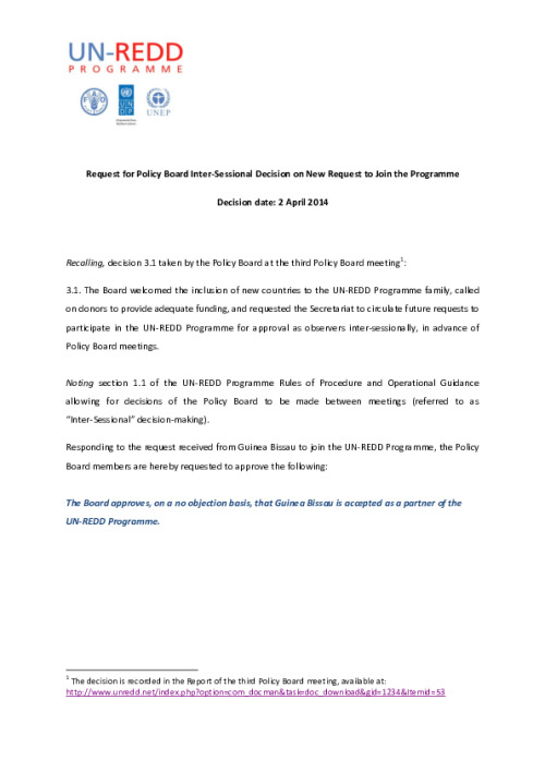 Home Document Library PB Intersessional Decision Request 32_New Request To Join The Programme_Guinea Bissau_EN PB intersessional decision request 32_New Request to Join the Programme_Guinea Bissau_EN Wed, 02 Apr, 2014 Download the resource Format: application/pdf Size: (0.303 MB) download Filed under: Category Intersessional Decisions Related publications View all Foundation documents 23 May, 2025UN-REDD Programme Developer 23/05/2025 - Document Download English 21 May, 2025UN-REDD Programme Draft UN-REDD 2026-2030 Strategy Download English 21 May, 2025UN-REDD Programme Draft Monitoring and Evaluation Framework UN-REDD 2026-30 Download English