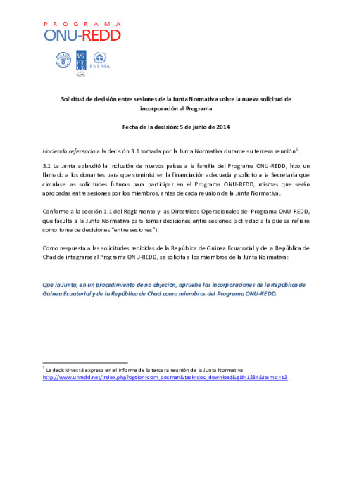 Home Document Library PB Intersessional Decision Request 33_ New Request To Join The Programme_Guinea Ecuatorial & Chad_SP PB intersessional decision request 33_ New Request to Join the Programme_Guinea Ecuatorial & Chad_SP Tue, 22 Jul, 2014 Download the resource Format: application/pdf Size: (0.51 MB) download Filed under: Category Intersessional Decisions Related publications View all Foundation documents 23 May, 2025UN-REDD Programme Developer 23/05/2025 - Document Download English 21 May, 2025UN-REDD Programme Draft UN-REDD 2026-2030 Strategy Download English 21 May, 2025UN-REDD Programme Draft Monitoring and Evaluation Framework UN-REDD 2026-30 Download English
