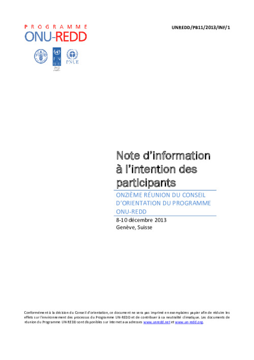 Home Document Library PB11 Information-Logistics Note (FR) PB11 Information-Logistics Note (FR) Thu, 14 Nov, 2013 Download the resource Format: application/pdf Size: (0.561 MB) download Filed under: Category Empty Related publications View all Foundation documents 23 May, 2025UN-REDD Programme Developer 23/05/2025 - Document Download English 21 May, 2025UN-REDD Programme Draft UN-REDD 2026-2030 Strategy Download English 21 May, 2025UN-REDD Programme Draft Monitoring and Evaluation Framework UN-REDD 2026-30 Download English