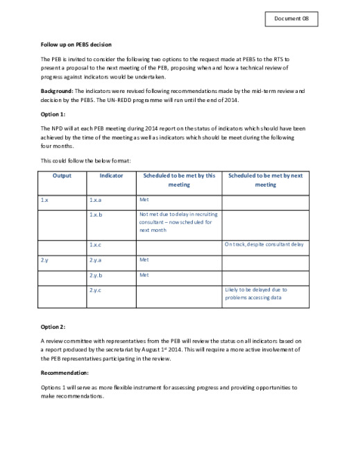 Home Document Library PEB 6 Doc 8 Follow Up On PEB5 Decision On Review of Indicators PEB 6 Doc 8 Follow up on PEB5 decision on review of indicators Fri, 09 May, 2014 Download the resource Format: application/pdf Size: (0.177 MB) download Filed under: Category Empty Related publications View all Foundation documents 23 May, 2025UN-REDD Programme Developer 23/05/2025 - Document Download English 21 May, 2025UN-REDD Programme Draft UN-REDD 2026-2030 Strategy Download English 21 May, 2025UN-REDD Programme Draft Monitoring and Evaluation Framework UN-REDD 2026-30 Download English