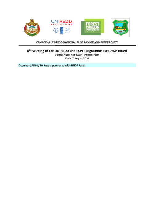 Home Document Library PEB 8-Document 10 Assets Purchased With UNDP Funds PEB 8-Document 10 Assets Purchased with UNDP funds Tue, 05 Aug, 2014 Download the resource Format: application/pdf Size: (0.884 MB) download Filed under: Category Empty Related publications View all Foundation documents 23 May, 2025UN-REDD Programme Developer 23/05/2025 - Document Download English 21 May, 2025UN-REDD Programme Draft UN-REDD 2026-2030 Strategy Download English 21 May, 2025UN-REDD Programme Draft Monitoring and Evaluation Framework UN-REDD 2026-30 Download English