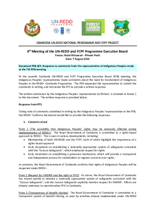 Home Document Library PEB 8-Document 5 Response To Comments From IP PEB 8-Document 5 Response to comments from IP Tue, 05 Aug, 2014 Download the resource Format: application/pdf Size: (0.476 MB) download Filed under: Category Empty Related publications View all Foundation documents 23 May, 2025UN-REDD Programme Developer 23/05/2025 - Document Download English 21 May, 2025UN-REDD Programme Draft UN-REDD 2026-2030 Strategy Download English 21 May, 2025UN-REDD Programme Draft Monitoring and Evaluation Framework UN-REDD 2026-30 Download English