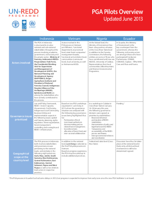 An overview of governance issues covered in the PGA pilots, actors involved and geographical scope per June 2013.