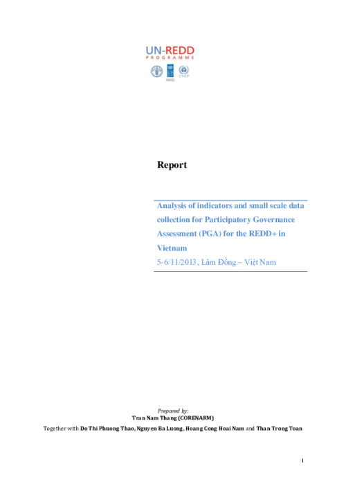 This report is a continuation of the documentation process of PGA in Vietnam through testing, analysis and synthesis of data collected using the tools which have been developed and adjusted from previous activities during 2013. After the first testing in July-August 2013, the tools and approaches were adjusted and completed to further facilitate the data collection process. This modified tool set was used in the second field testing conducted during November 5 – November 6, 2013. Results collected from this testing were used to analyze and assess the tools in terms of capacity to collect data on indicators as well as to assess forest management activities in Lam Dong province.