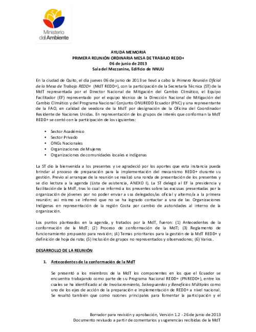Home Document Library PRIMERA REUNIÓN ORDINARIA MESA DE TRABAJO REDD+ PRIMERA REUNIÓN ORDINARIA MESA DE TRABAJO REDD+ Fri, 28 Jun, 2013 Download the resource Format: application/pdf Size: (0.792 MB) download Filed under: Category Empty Related publications View all Foundation documents 23 May, 2025UN-REDD Programme Developer 23/05/2025 - Document Download English 21 May, 2025UN-REDD Programme Draft UN-REDD 2026-2030 Strategy Download English 21 May, 2025UN-REDD Programme Draft Monitoring and Evaluation Framework UN-REDD 2026-30 Download English