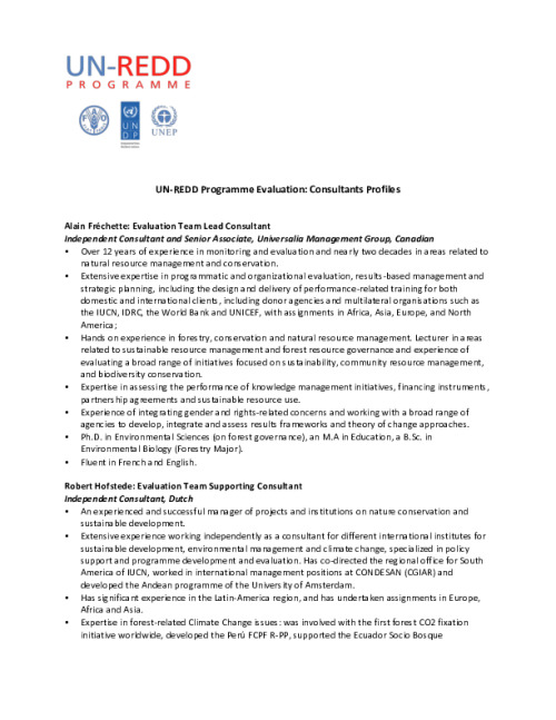 Home Document Library Programme Evaluation Consultants Profiles Programme Evaluation Consultants profiles Mon, 13 Jan, 2014 Download the resource Format: application/pdf Size: (0.107 MB) download Filed under: Category Empty Related publications View all Foundation documents 23 May, 2025UN-REDD Programme Developer 23/05/2025 - Document Download English 21 May, 2025UN-REDD Programme Draft UN-REDD 2026-2030 Strategy Download English 21 May, 2025UN-REDD Programme Draft Monitoring and Evaluation Framework UN-REDD 2026-30 Download English