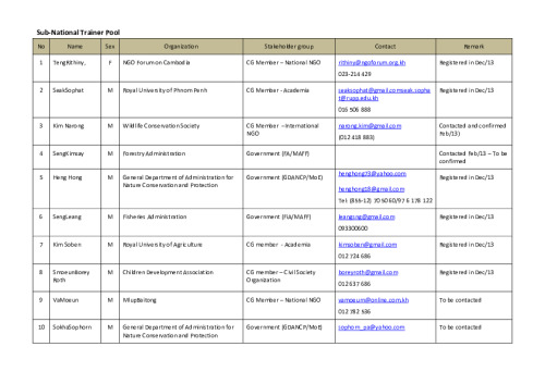 Home Document Library RECOFTC Contract Deliverable 10 - List of 10 Trainer Pool RECOFTC Contract Deliverable 10 - List of 10 Trainer pool Thu, 29 May, 2014 Download the resource Format: application/pdf Size: (0.187 MB) download Filed under: Category Empty Related publications View all Foundation documents 23 May, 2025UN-REDD Programme Developer 23/05/2025 - Document Download English 21 May, 2025UN-REDD Programme Draft UN-REDD 2026-2030 Strategy Download English 21 May, 2025UN-REDD Programme Draft Monitoring and Evaluation Framework UN-REDD 2026-30 Download English