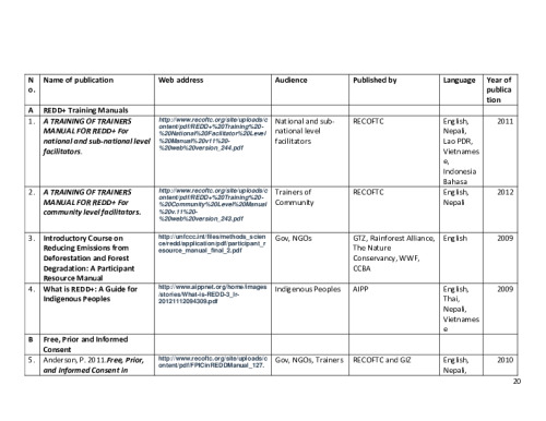 Home Document Library RECOFTC Contract Deliverable 4 - List of Training Materials RECOFTC Contract Deliverable 4 - List of training materials Thu, 29 May, 2014 Download the resource Format: application/pdf Size: (0.374 MB) download Filed under: Category Empty Related publications View all Foundation documents 23 May, 2025UN-REDD Programme Developer 23/05/2025 - Document Download English 21 May, 2025UN-REDD Programme Draft UN-REDD 2026-2030 Strategy Download English 21 May, 2025UN-REDD Programme Draft Monitoring and Evaluation Framework UN-REDD 2026-30 Download English