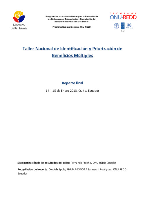 Home Document Library Reporte Taller Nacional Priorizacion Beneficios Multiples Enero Reporte taller nacional priorizacion beneficios multiples enero Wed, 12 Nov, 2014 Download the resource Format: application/pdf Size: (1.669 MB) download Filed under: Category Empty Related publications View all Foundation documents 23 May, 2025UN-REDD Programme Developer 23/05/2025 - Document Download English 21 May, 2025UN-REDD Programme Draft UN-REDD 2026-2030 Strategy Download English 21 May, 2025UN-REDD Programme Draft Monitoring and Evaluation Framework UN-REDD 2026-30 Download English