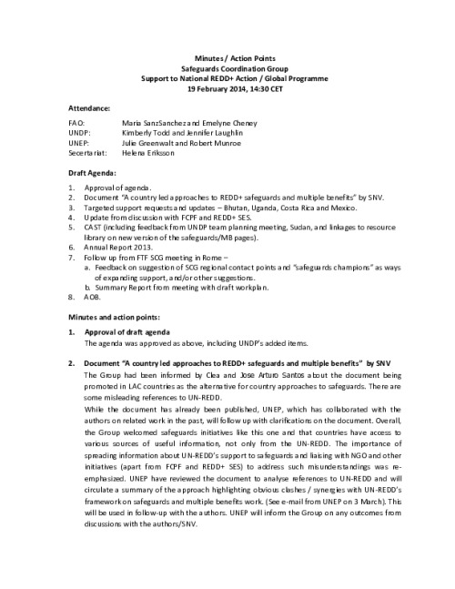 Home Document Library Safeguards_Coordination_Group_ Minutes_Conf Call 19 Feb 2014 Safeguards_Coordination_Group_ minutes_Conf call 19 Feb 2014 Thu, 20 Mar, 2014 Download the resource Format: application/pdf Size: (0.374 MB) download Filed under: Category Empty Related publications View all Foundation documents 23 May, 2025UN-REDD Programme Developer 23/05/2025 - Document Download English 21 May, 2025UN-REDD Programme Draft UN-REDD 2026-2030 Strategy Download English 21 May, 2025UN-REDD Programme Draft Monitoring and Evaluation Framework UN-REDD 2026-30 Download English