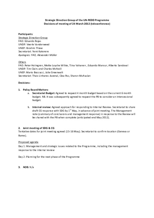 Home Document Library SDG Minutes 24 March 2012 SDG minutes 24 March 2012 Tue, 11 Nov, 2014 Download the resource Format: application/pdf Size: (0.062 MB) download Filed under: Category Empty Related publications View all Foundation documents 23 May, 2025UN-REDD Programme Developer 23/05/2025 - Document Download English 21 May, 2025UN-REDD Programme Draft UN-REDD 2026-2030 Strategy Download English 21 May, 2025UN-REDD Programme Draft Monitoring and Evaluation Framework UN-REDD 2026-30 Download English