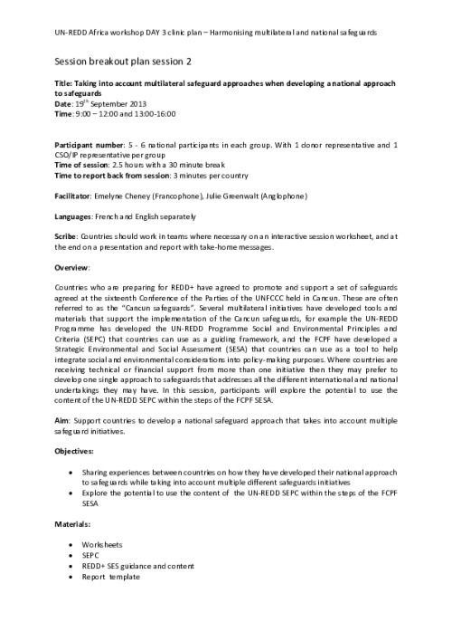 Home Document Library Session Plan_2_Harmonising Multilateral and National Safeguards Session plan_2_Harmonising multilateral and national safeguards Tue, 19 Nov, 2013 Download the resource Format: application/pdf Size: (0.568 MB) download Filed under: Category Empty Related publications View all Foundation documents 23 May, 2025UN-REDD Programme Developer 23/05/2025 - Document Download English 21 May, 2025UN-REDD Programme Draft UN-REDD 2026-2030 Strategy Download English 21 May, 2025UN-REDD Programme Draft Monitoring and Evaluation Framework UN-REDD 2026-30 Download English