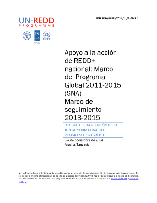 Home Document Library SNA Monitoring Framework 2013-2015 ESP SNA Monitoring Framework 2013-2015 ESP Thu, 06 Nov, 2014 Download the resource Format: application/pdf Size: (0.55 MB) download Filed under: Category Empty Related publications View all Foundation documents 23 May, 2025UN-REDD Programme Developer 23/05/2025 - Document Download English 21 May, 2025UN-REDD Programme Draft UN-REDD 2026-2030 Strategy Download English 21 May, 2025UN-REDD Programme Draft Monitoring and Evaluation Framework UN-REDD 2026-30 Download English