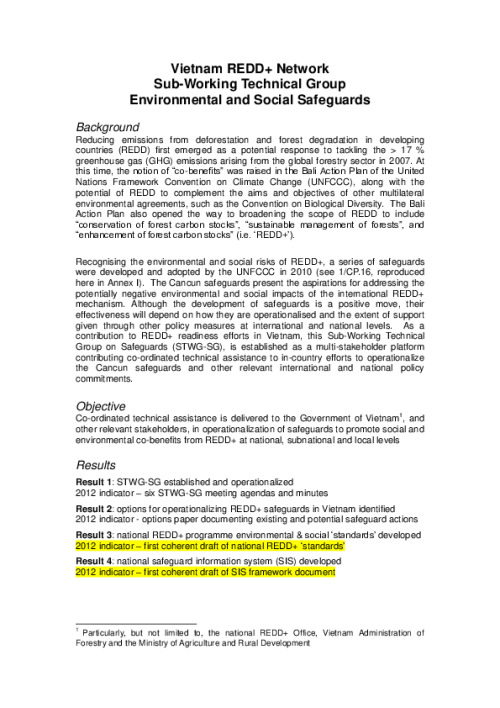 Home Document Library STWG-Safeguard TOR & AWP STWG-Safeguard TOR & AWP Tue, 29 Oct, 2013 Download the resource Format: application/pdf Size: (0.17 MB) download Filed under: Category Empty Related publications View all Foundation documents 23 May, 2025UN-REDD Programme Developer 23/05/2025 - Document Download English 21 May, 2025UN-REDD Programme Draft UN-REDD 2026-2030 Strategy Download English 21 May, 2025UN-REDD Programme Draft Monitoring and Evaluation Framework UN-REDD 2026-30 Download English