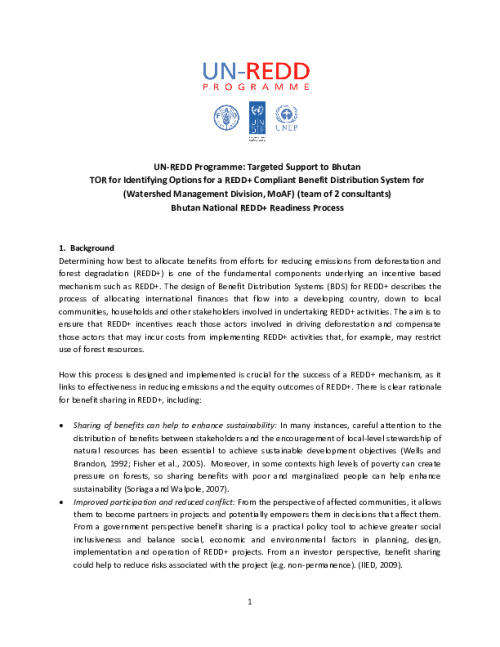 Home Document Library TOR For REDD+ and PEI Benefit Distribution TOR for REDD+ and PEI benefit distribution Mon, 27 May, 2013 Download the resource Format: application/pdf Size: (0.531 MB) download Filed under: Category Empty Related publications View all Foundation documents 23 May, 2025UN-REDD Programme Developer 23/05/2025 - Document Download English 21 May, 2025UN-REDD Programme Draft UN-REDD 2026-2030 Strategy Download English 21 May, 2025UN-REDD Programme Draft Monitoring and Evaluation Framework UN-REDD 2026-30 Download English