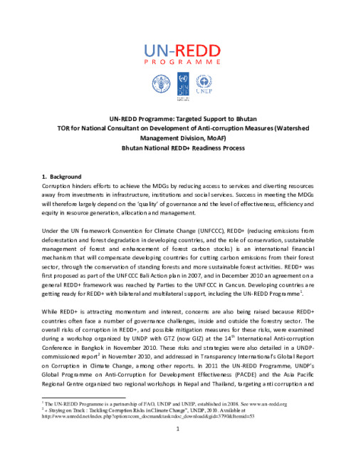 Home Document Library TOR For REDD+ Anti-corruption Measures TOR for REDD+ anti-corruption measures Mon, 27 May, 2013 Download the resource Format: application/pdf Size: (0.302 MB) download Filed under: Category Empty Related publications View all Foundation documents 23 May, 2025UN-REDD Programme Developer 23/05/2025 - Document Download English 21 May, 2025UN-REDD Programme Draft UN-REDD 2026-2030 Strategy Download English 21 May, 2025UN-REDD Programme Draft Monitoring and Evaluation Framework UN-REDD 2026-30 Download English