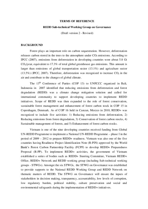 Home Document Library TOR For STWG On Governance TOR for STWG on Governance Tue, 29 Oct, 2013 Download the resource Format: application/pdf Size: (0.188 MB) download Filed under: Category Empty Related publications View all Foundation documents 23 May, 2025UN-REDD Programme Developer 23/05/2025 - Document Download English 21 May, 2025UN-REDD Programme Draft UN-REDD 2026-2030 Strategy Download English 21 May, 2025UN-REDD Programme Draft Monitoring and Evaluation Framework UN-REDD 2026-30 Download English