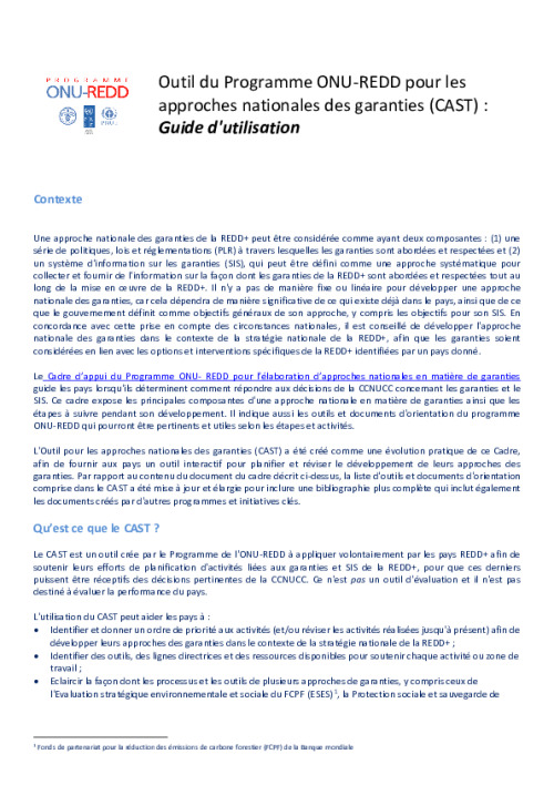 Home Document Library UN-REDD Programme - CAST - Guide D'utilisation (Français) UN-REDD Programme - CAST - Guide d'utilisation (Français) Mon, 01 Sep, 2014 Download the resource Format: application/pdf Size: (0.767 MB) download Filed under: Category Empty Related publications View all Foundation documents 23 May, 2025UN-REDD Programme Developer 23/05/2025 - Document Download English 21 May, 2025UN-REDD Programme Draft UN-REDD 2026-2030 Strategy Download English 21 May, 2025UN-REDD Programme Draft Monitoring and Evaluation Framework UN-REDD 2026-30 Download English