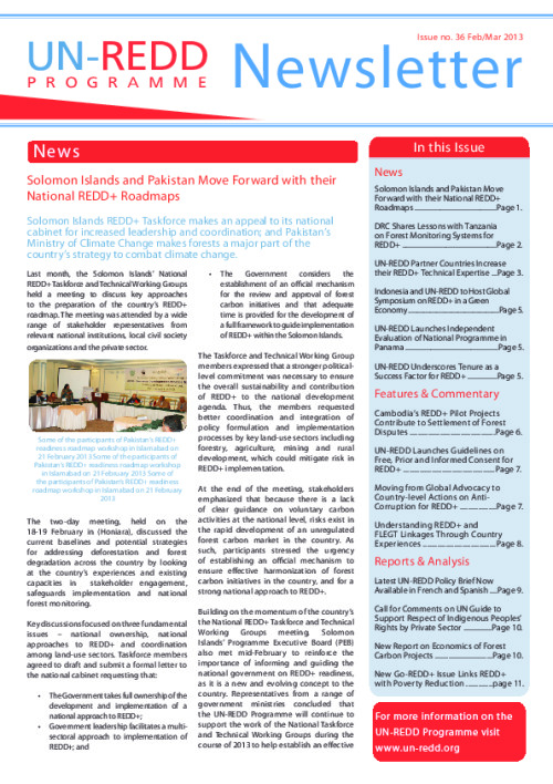 Home Document Library UN-REDD PROGRAMME NEWSLETTER - ISSUE 36- PRINTABLE UN-REDD PROGRAMME NEWSLETTER - ISSUE 36- PRINTABLE Wed, 17 Apr, 2013 Download the resource Format: application/pdf Size: (1.905 MB) download Filed under: Category Newsletters Related publications View all Foundation documents 23 May, 2025UN-REDD Programme Developer 23/05/2025 - Document Download English 21 May, 2025UN-REDD Programme Draft UN-REDD 2026-2030 Strategy Download English 21 May, 2025UN-REDD Programme Draft Monitoring and Evaluation Framework UN-REDD 2026-30 Download English