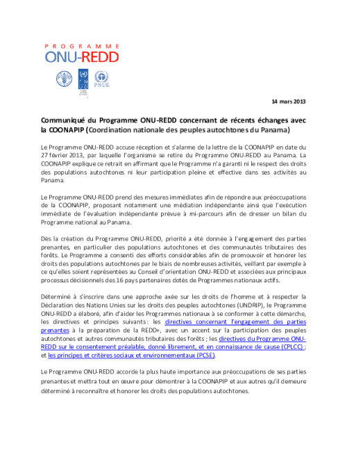 Home Document Library UN-REDD Programme Statement Regarding Recent Communications With COONAPIP - FRENCH UN-REDD Programme Statement Regarding Recent Communications With COONAPIP - FRENCH Fri, 15 Mar, 2013 Download the resource Format: application/pdf Size: (0.074 MB) download Filed under: Category Press releases Related publications View all Foundation documents 23 May, 2025UN-REDD Programme Developer 23/05/2025 - Document Download English 21 May, 2025UN-REDD Programme Draft UN-REDD 2026-2030 Strategy Download English 21 May, 2025UN-REDD Programme Draft Monitoring and Evaluation Framework UN-REDD 2026-30 Download English