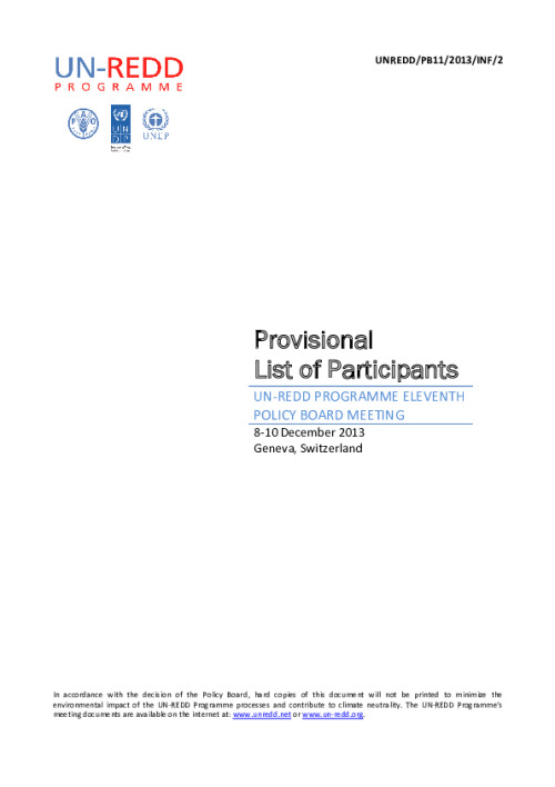 Home Document Library UNREDD PB11 List of Participants UNREDD PB11 List of Participants Fri, 06 Dec, 2013 Download the resource Format: application/pdf Size: (0.304 MB) download Filed under: Category Empty Related publications View all Foundation documents 23 May, 2025UN-REDD Programme Developer 23/05/2025 - Document Download English 21 May, 2025UN-REDD Programme Draft UN-REDD 2026-2030 Strategy Download English 21 May, 2025UN-REDD Programme Draft Monitoring and Evaluation Framework UN-REDD 2026-30 Download English